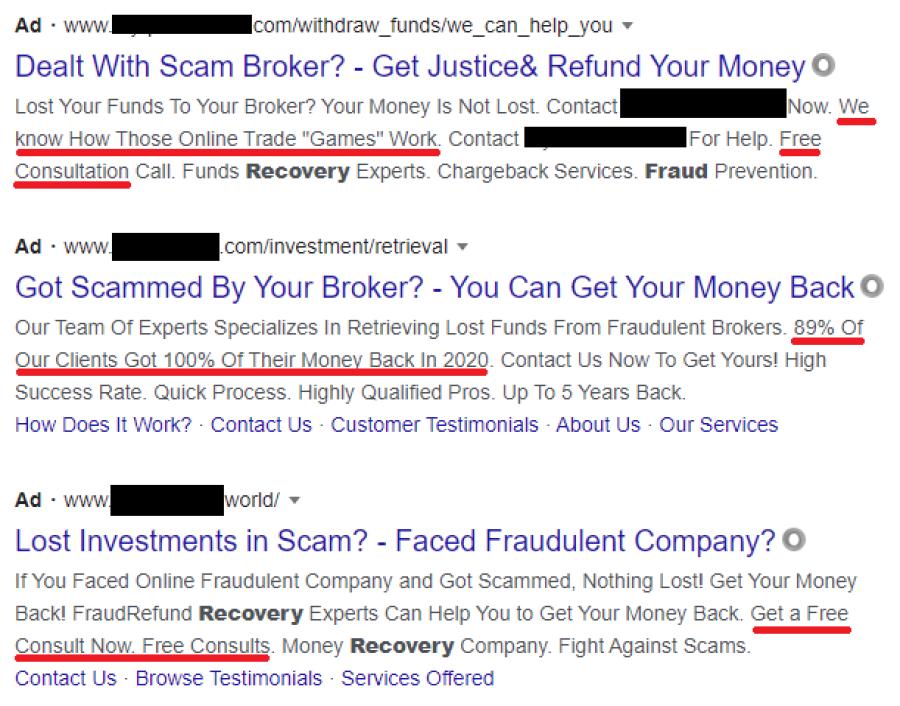 Despite it being quite clear that cryptocurrency transactions are irreversible, there are plenty of companies confidently boasting that they can help victims of scams recover their cryptocurrency. All of them follow the same patterns. Firstly, they heavily promote their services through mediums such as search engines: