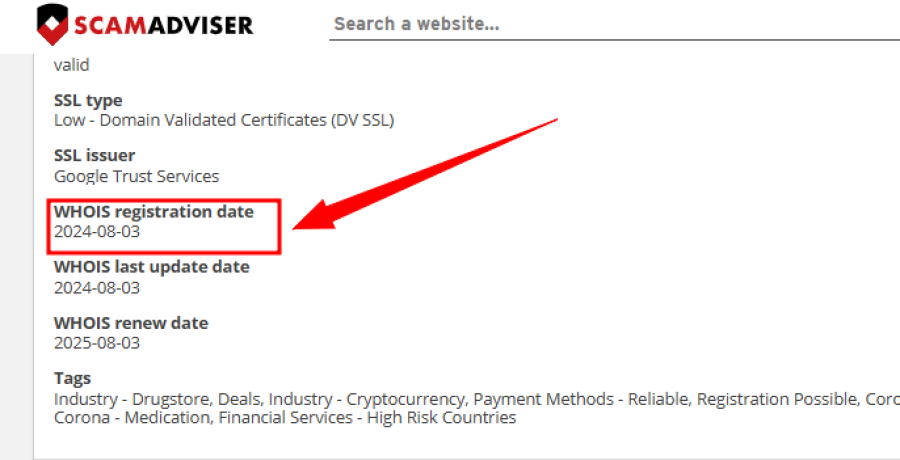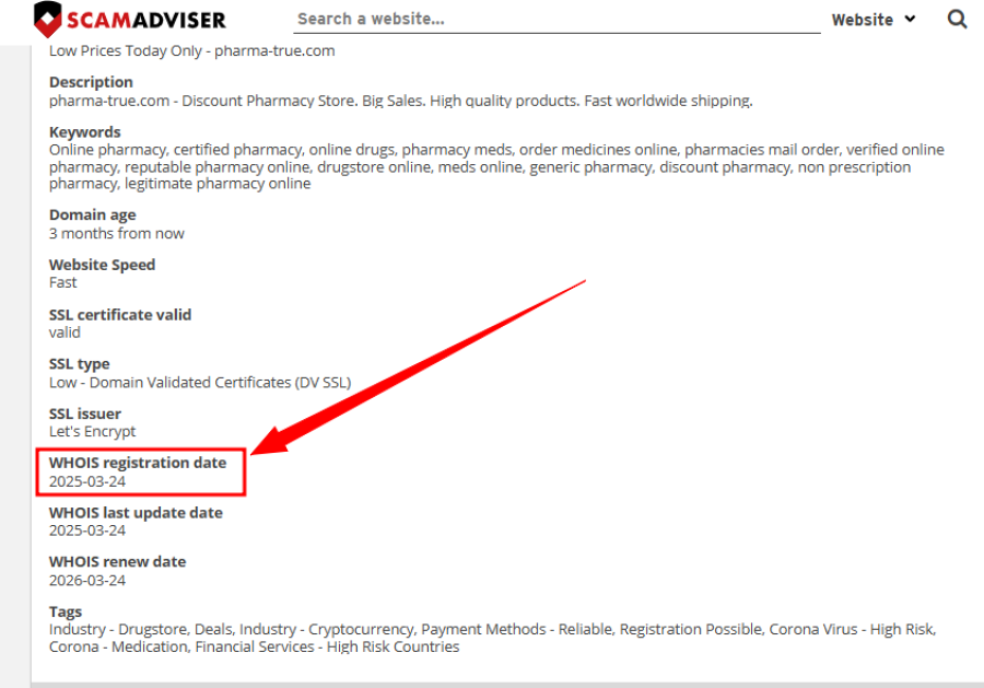 According to their homepage, Citaedtre.com claims to have over 20 years of experience in the online pharmacy industry. This kind of statement is meant to build trust with visitors. However, when we conducted a Whois domain lookup and reviewed information from ScamAdviser, we found a completely different story.