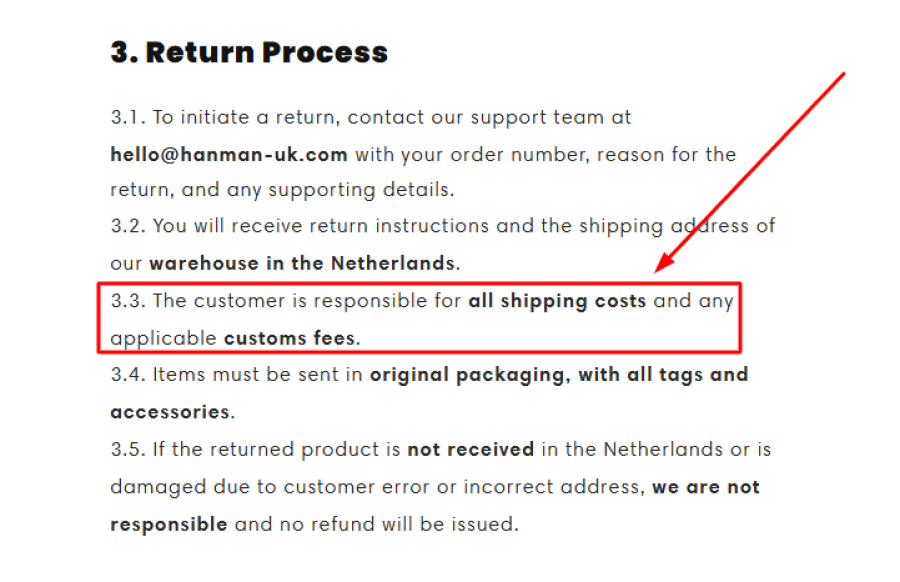 Hanman-uk.com does offer a return policy, but it’s far from straightforward. According to the site’s return policy page, customers must cover the cost of return shipping, even if the product is defective or not as described.
