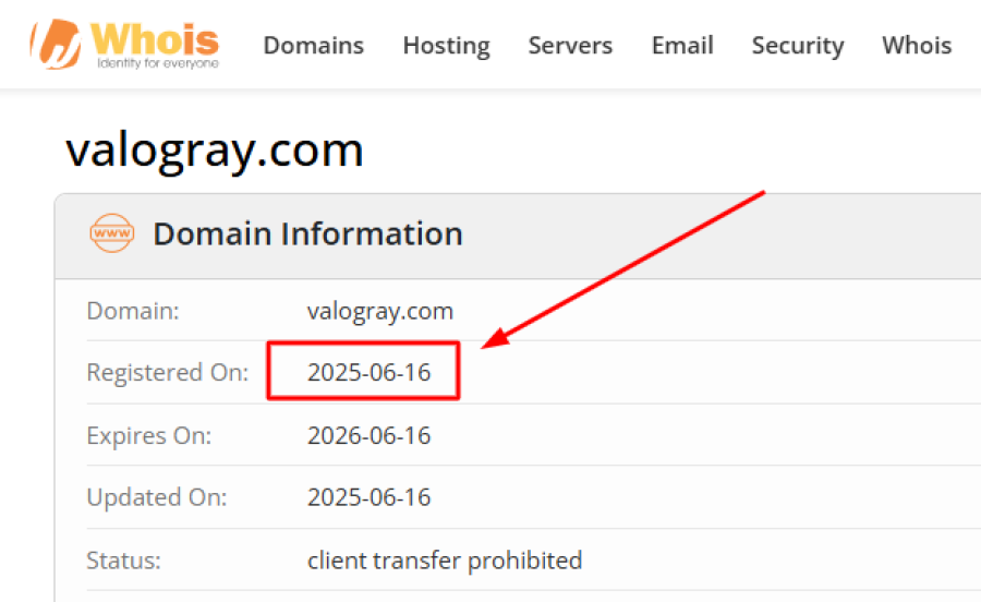 Valogray.com is a very new site. According to domain data from Whois.com and ScamAdviser, it was registered on June 16, 2025. That alone does not necessarily mean it's a scam, but when paired with the lack of transparency and community trust, it raises serious concerns.