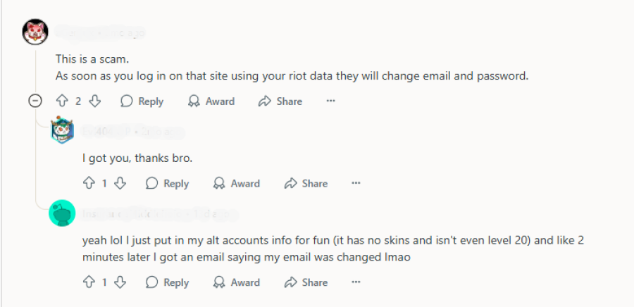 In gaming forums and discussions, users have been warning others about the site. Some claim that as soon as you log in with your Riot Games account, your email and password are changed, effectively locking you out.