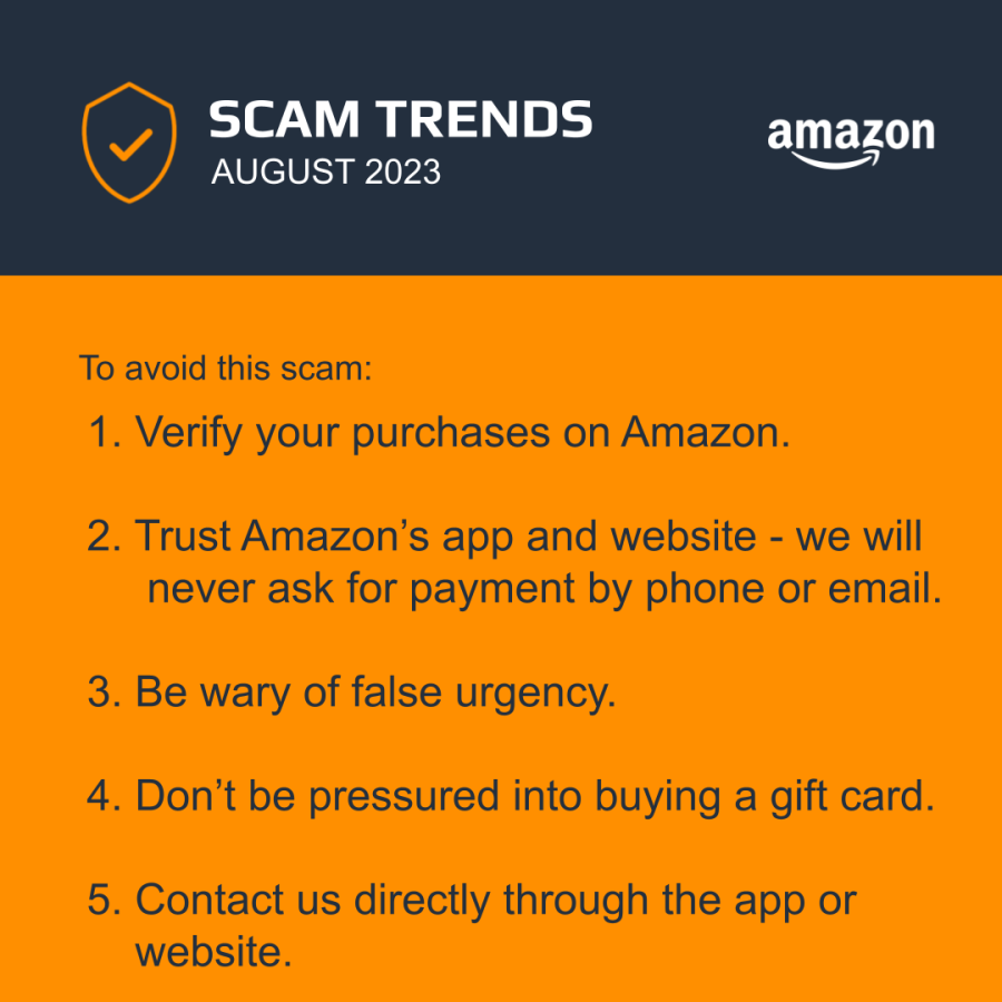 Top scam to avoid. Among all impersonation scams reported by Amazon customers so far in 2023, fake messages about suspicious activity on your Amazon account rank as the top scam tactic, accounting for more than one-quarter of all the reports. This scam tactic, also known as “Suspicious Activity Scams”, has reached Amazon customers in more than 20 countries globally this year, including more than 15 in the month of July alone.