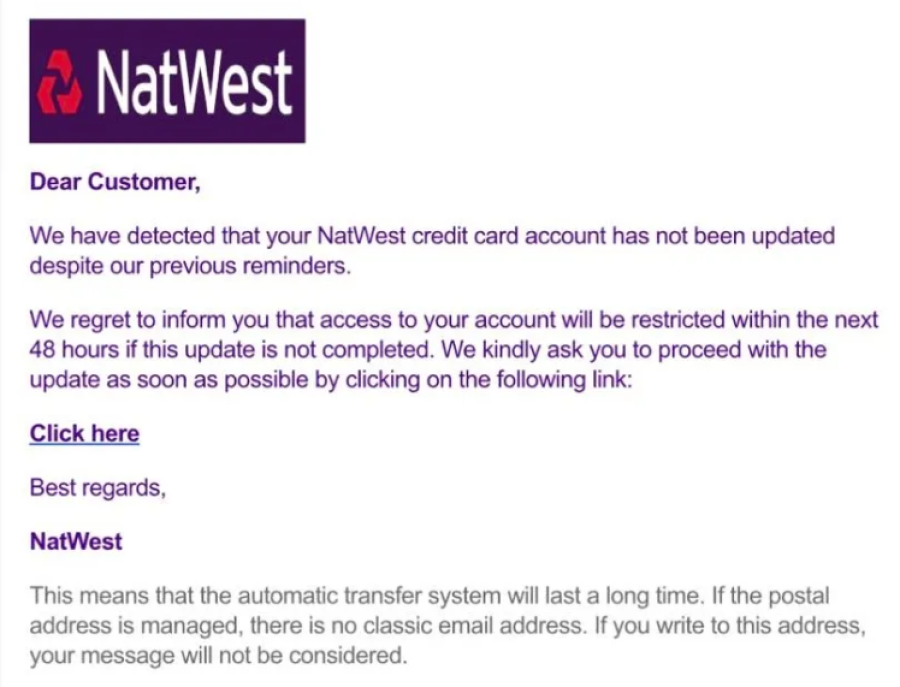 You get an email from "NatWest" telling you your credit card account hasn't been updated and that you'll lose access in 48 hours. They even throw in a helpful link to "update" your details—how thoughtful! But hold on, this isn’t customer service; it’s a scam. That link leads straight to a shady site looking to swipe your info. Real banks don’t pressure you with ticking clocks or dodgy links. So, take a deep breath, ignore the scare tactics, and delete the email. Your account is probably just fine!