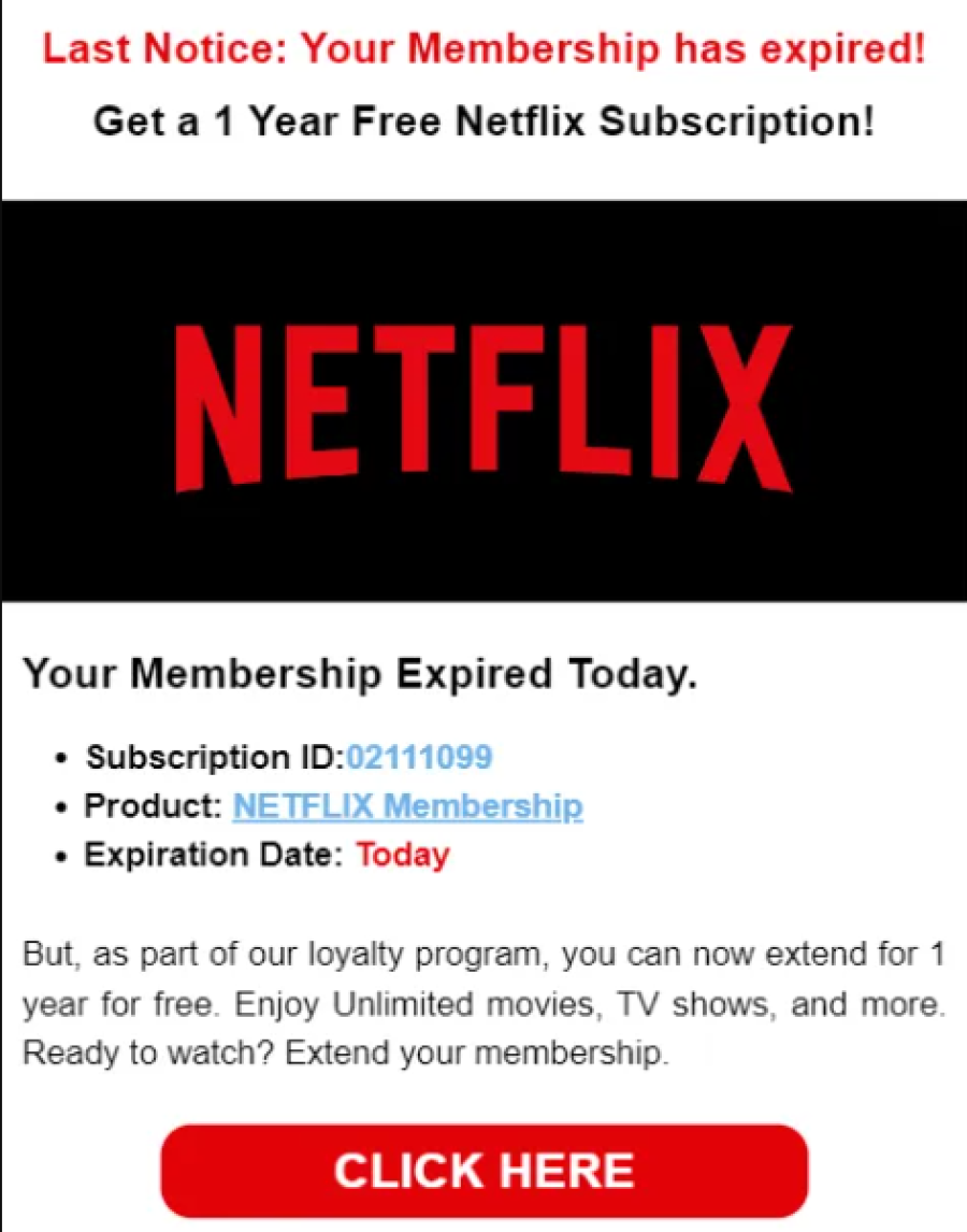 You open your inbox to see a message that looks like it's from Netflix, saying, "Your membership expired today." No worries, they’ve got a deal for you – click this link for a "free year of Netflix." Sounds too good to be true, right? Well, it is! That link will whisk you off to a malicious website fishing for your personal info. Instead of free movies, you'll end up with a starring role in an identity theft nightmare. Always double-check before clicking—free online things rarely come without a catch!