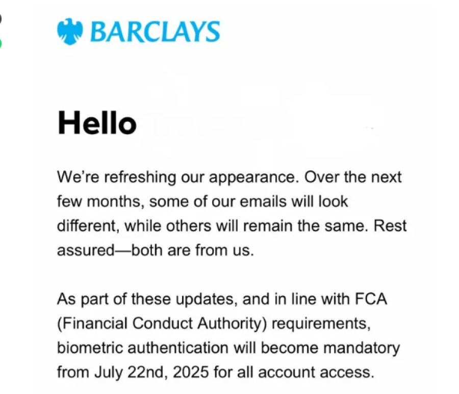 Primiți un e-mail de la Barclays, cu numele dvs. în întâmpinare și un ton foarte oficial. Mesajul spune că, din cauza noilor cerințe ale FCA, toți clienții trebuie să activeze imediat autentificarea biometrică - prin scanarea amprentei sau a feței. Există chiar și un mic buton ordonat pe care scrie "Get Started".