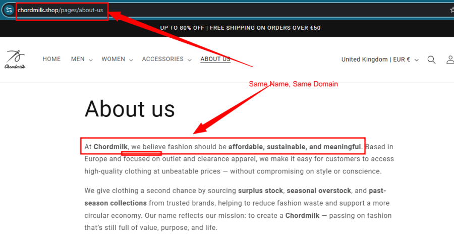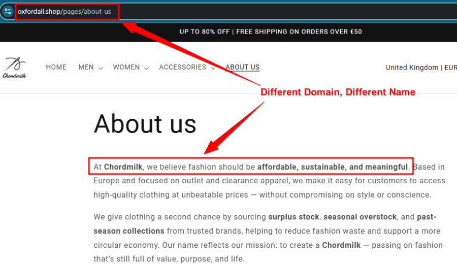 The first red flag? Oxfordall.shop refers to itself as Chordmilk—the exact name and branding of another questionable site, Chordmilk.shop. That’s not just a coincidence. They use the same product descriptions, layout, and style.
