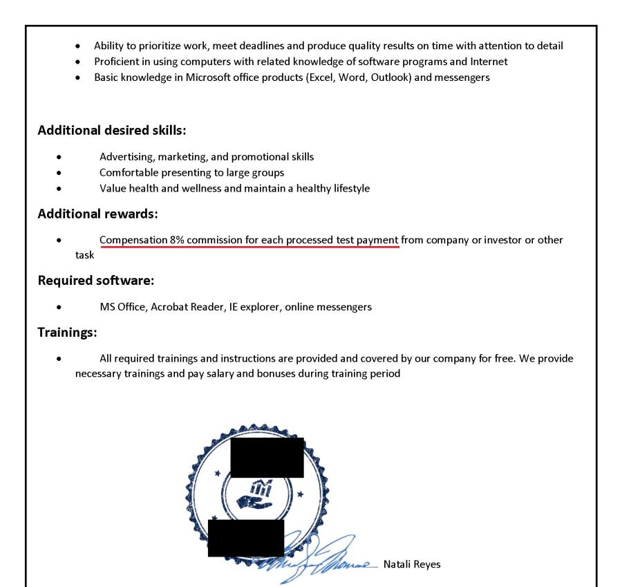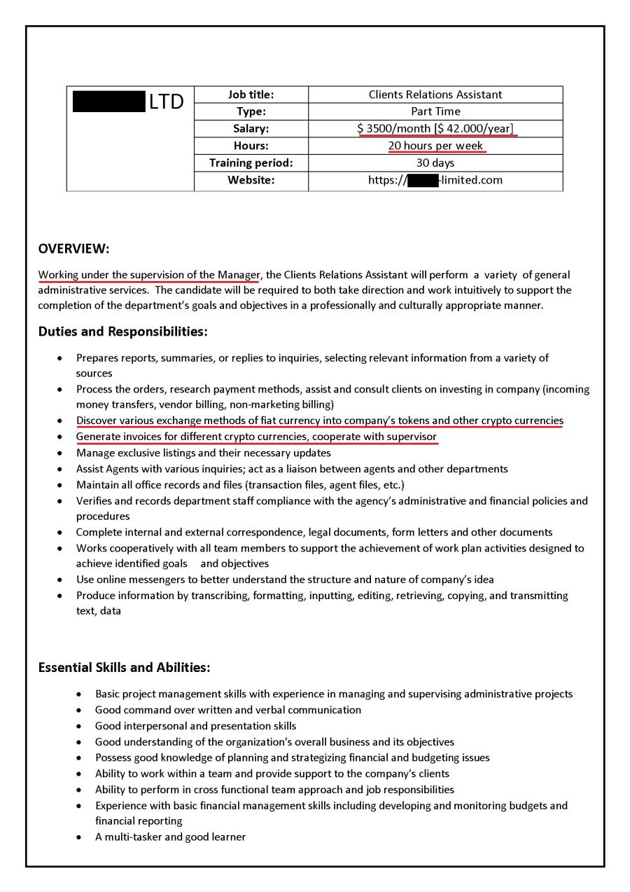 Their ‘Client Relations’ job pays an absurd $42,000/year for part-time work and entails discovering ‘exchange methods of fiat currency into company’s tokens’. In addition to the salary of $42,000/year, the employee was also entitled for an 8% commission ‘for each processed test payment’. None of these things seem to have any real connection with the company’s supposed business of ‘cloud mining’.