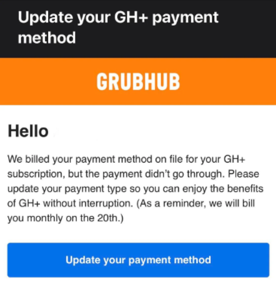 You get an email about updating your Grubhub+ payment method — except you never signed up. When you check the site using your email, there’s a profile with your address and someone else’s name. No order history, but a subscription is active.