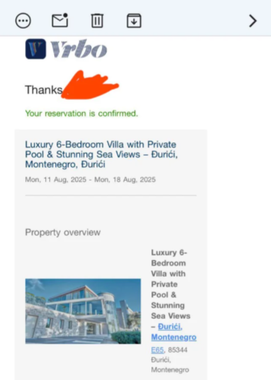 A too-good-to-be-true villa in Montenegro appears on a trusted platform. When the booking is “rejected,” the owner emails directly, sharing a new link — supposedly to Vrbo.