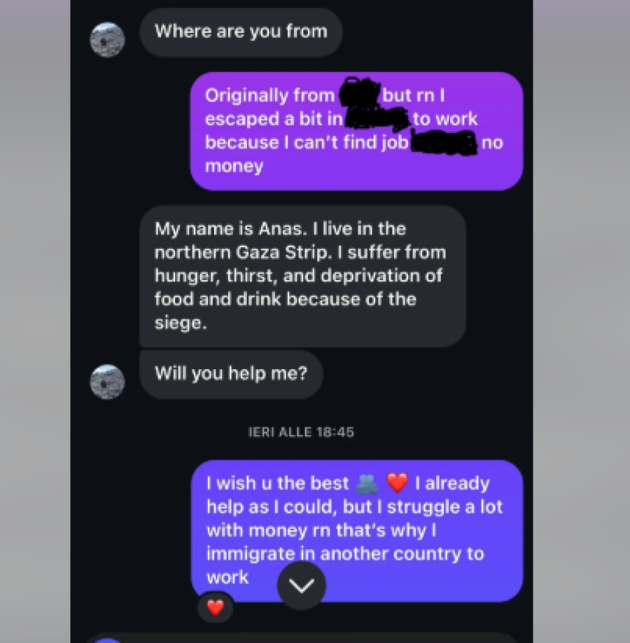 Someone claiming to be a teenager in a conflict zone, like Palestine, reaches out asking for financial help. They share emotional videos, stories, and even an ID photo.