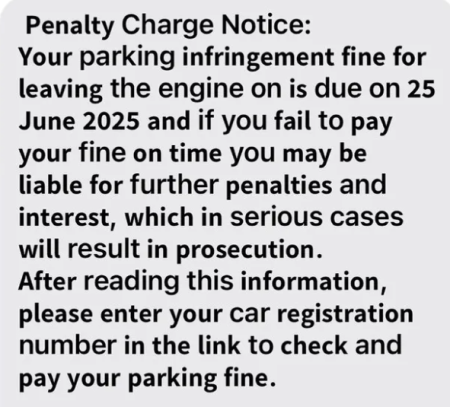 A text says you’ve been fined for leaving your engine running — and gives you a link to pay immediately. Sounds urgent, but it’s a setup.