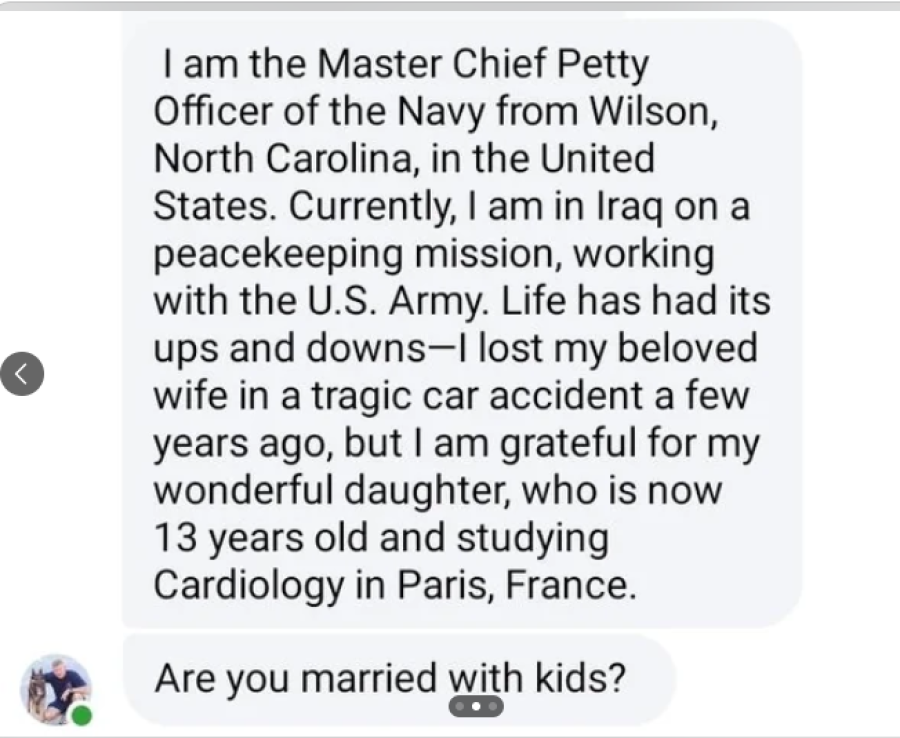 You accept a friend request. Then come the messages — they’re from a widower stationed overseas, with a tragic backstory and a child in another country. Things move quickly, and soon there’s talk of needing help.